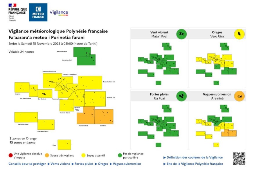 Météo-France Polynésie a placé plusieurs archipels du fenua en vigilance ce samedi matin, en raison d’un double risque : des orages parfois intenses et une houle massive venue du Sud.